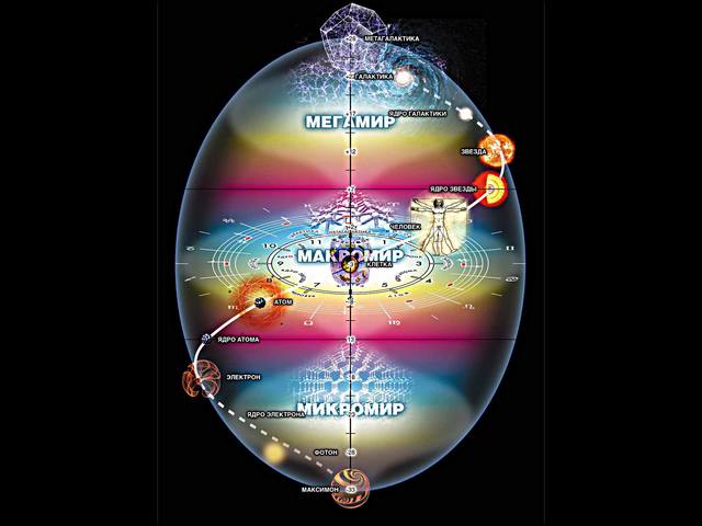 Что-то в этой схеме мне кажется слишком простым. Получается, что чем больше физическая система (объект), тем выше она стоит в иерархии Духа. Однако, человек гораздо меньше секвойи (в 50 раз), а духовность его при этом несомненно выше. Этак мы договоримся до того, что огромная мусорная свалка раз она больше, то и в иерархии она выше. Одним из моих заметных открытий является то, что я нашел МЦВ — масштабный центр Вселенной — 50 мкм. Именно такой размер у малого атмана или ЗМД — зерна мирового духа. Информационная емкость у него сумасшедшая — 10 в 90-й степени факториал. Это флешки информационно поля Вселенной. Именно в масштабном центре Вселенной и живут наиболее сложные в информационном планет тонки структуры — монады Лейбница. И сложность нисходит от них вправо (в сторону космоса) и влево (в сторону микромира). Эта схема была мне «спущена сверху еще в начале 70-х