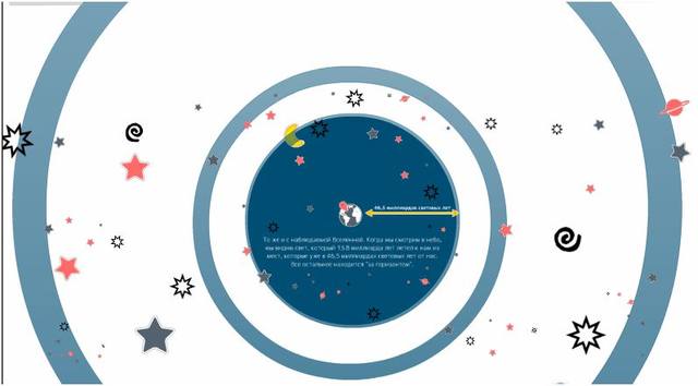 | _004 -- Сейчас большая часть ученых зациклилась на гипотезе большого взрыва. Считается, что был такой момент, когда все то, что нас окружает, не существовало. А потом произошел БОЛЬШОЙ ВЗРЫВ. И после этого стала развиваться и эволюционировать Вселенная. Но ведь речь идет только о видимой вселенной, размеры которой по разным версиям не превышают несколько десятков миллиардов световых лет. Да, этот шарик РАСШИРЯЕТСЯ. Но когда сперматозоид достигает яйцеклетки и оплодотворяет ее, тоже начинается расширение. И в дальнейшем эмбрион человека достигает гигантских размеров по сравнению с маленькой начальной клеточкой. Но все же процесс этот имеет предел. Так почему не допустить, что нечто похожее происходит и со всей наблюдаемой вселенной в целом. Да она расширяется, но в свой срок достигнет какой-то предельной величины. И затем рост прекратится. А еще через какое-то время эта огромная форма РАСПАДЕТСЯ, как распадается любая живая форма на Земле после своей смерти. Давайте посмотрим с помощью схемок на размеры нашей вселенной. Автор рисунков уточняет, что для нас доступна ТОЛЬКО та ее часть, которую мы можем наблюдать в телескопы. А вся вселенная гораздо больше. И скорее всего она БЕСКОНЕЧНА.